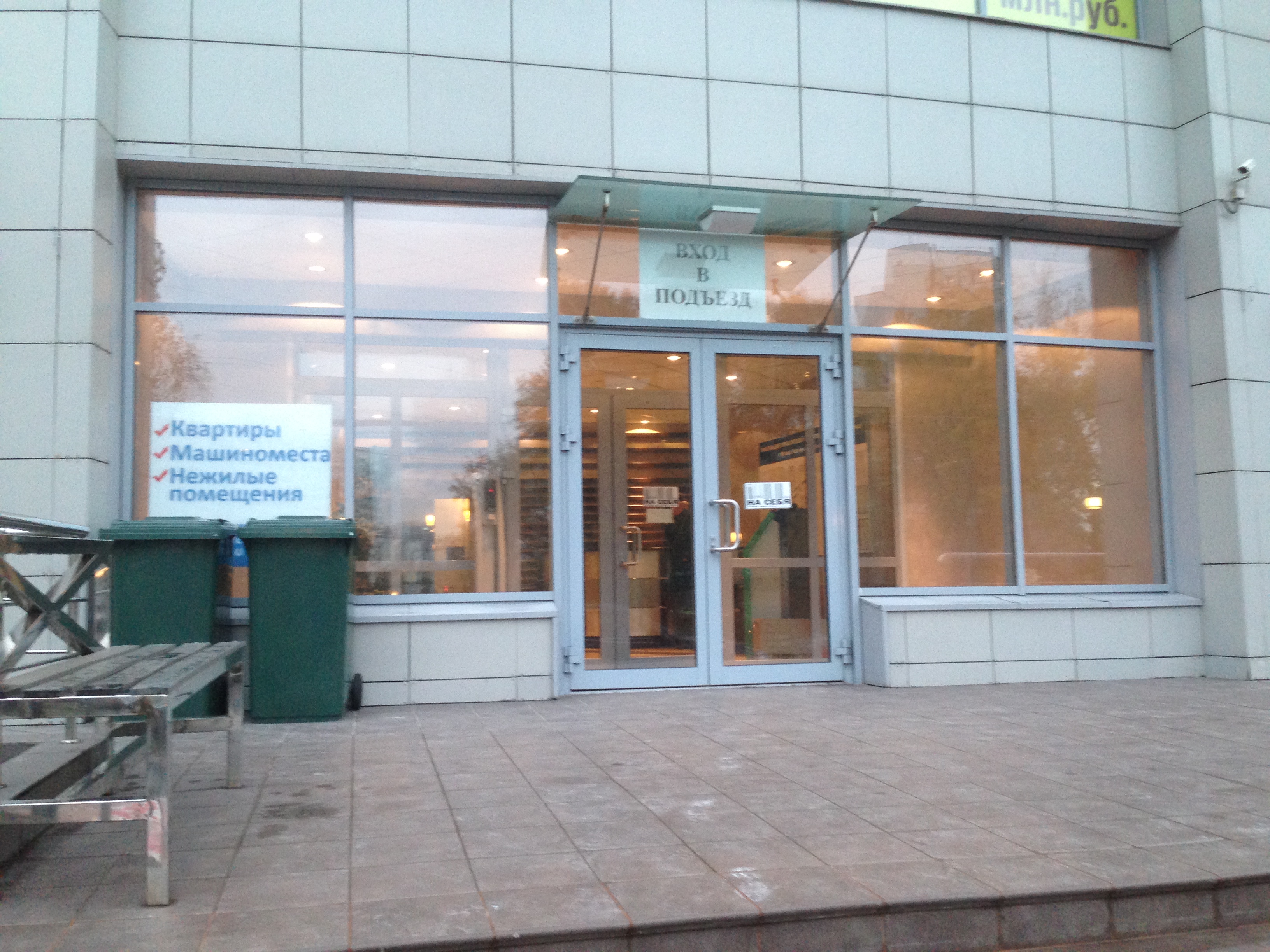 На входе висит реклама агенств по недвижимости. Клиника, банк и ногтевая студия имеют вывески превышающие допустимые размеры для вывесок, а следовательно они являются рекламой. На каждом этаже висит табличка с номером этажа и рекламной информацией от провайдера услуг связи и тв.